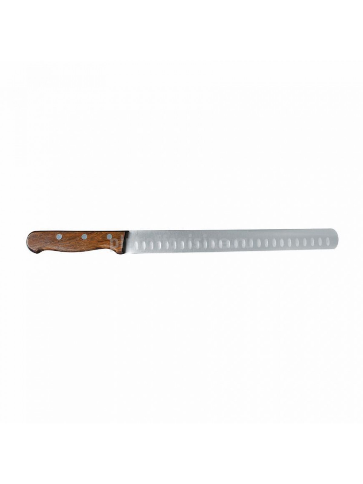 Поварской нож для ветчины представляет собой длинное (21-31 см), узкое, тонкое гибкое закругленное на конце полотно, позволяет нарезать тонкие и ровные куски ветчины, филе мяса и рыбы одним движением ножа. У некоторых самых длинных моделей на лезвии имеется зубчатая насечка из воздушных кармашков. Они способствуют более качественной нарезке тонких кусочков мяса, не позволяют лепесткам налипать на полотно ножа и деформироваться.