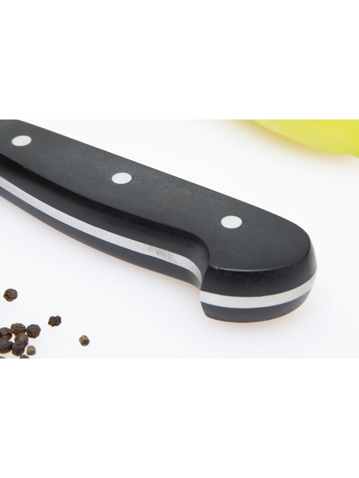 Рукоятка из полиоксиметилена (РОМ) – выполнена из размеренно устойчивого и жесткого пластика, соответствующего европейским пищевым стандартам. Склеенный в два или три слоя внешний прочный материал обеспечивает надежное положение ножа в руке при всех видах кухонных работ.